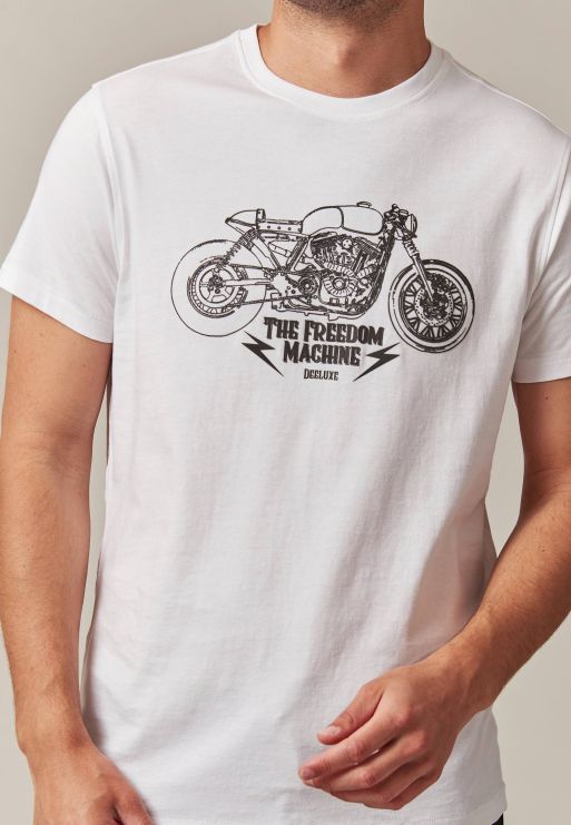 Its design features a vintage motorcycle illustration , accompanied by the iconic inscription ' The Freedom Machine '. This combination of visuals celebrates the freedom and excitement of great road trips.