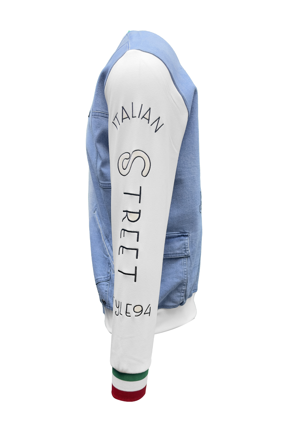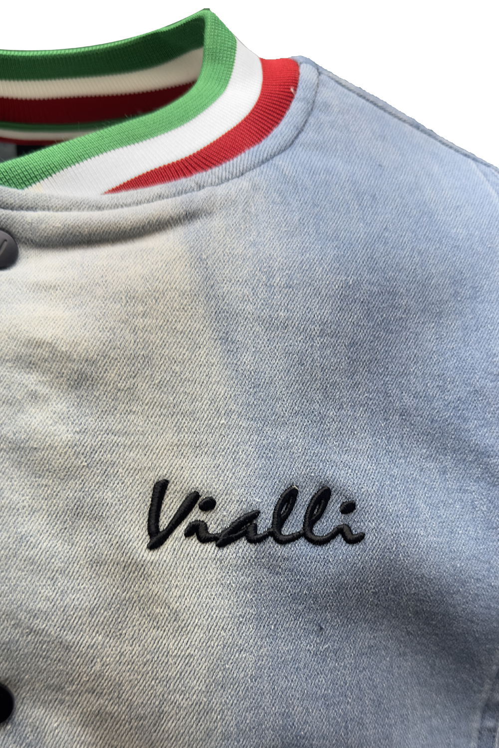 Introducing the Vialli Doncic Denim Jacket, a stylish and versatile addition to any wardrobe. Made with a blend of cotton, polyester, and spandex, this jacket offers comfort and flexibility. The embroidered details on the front and back, along with the Italian colors on the collar and sleeves, add a touch of sophistication. Stay on-trend with this button-down jacket.