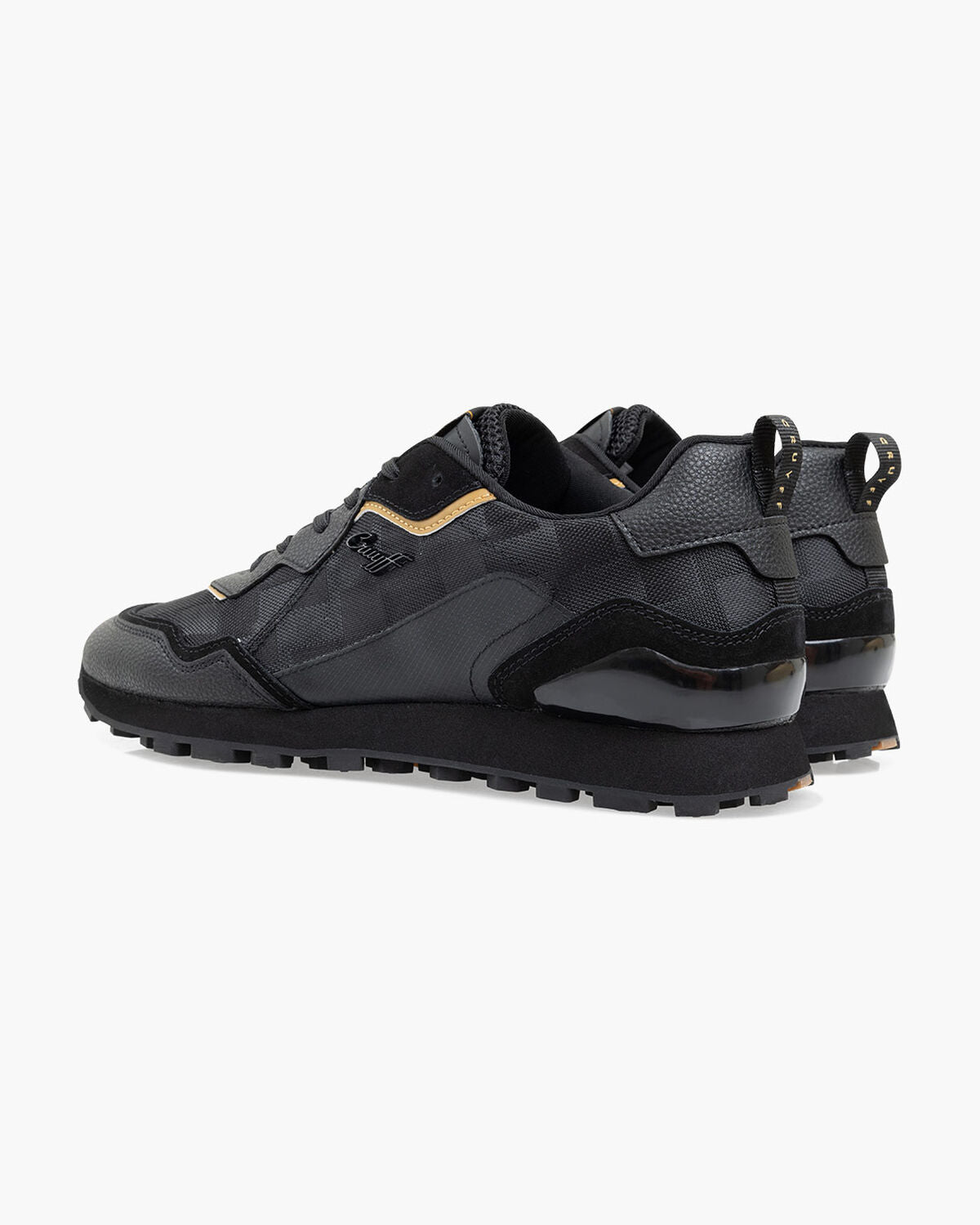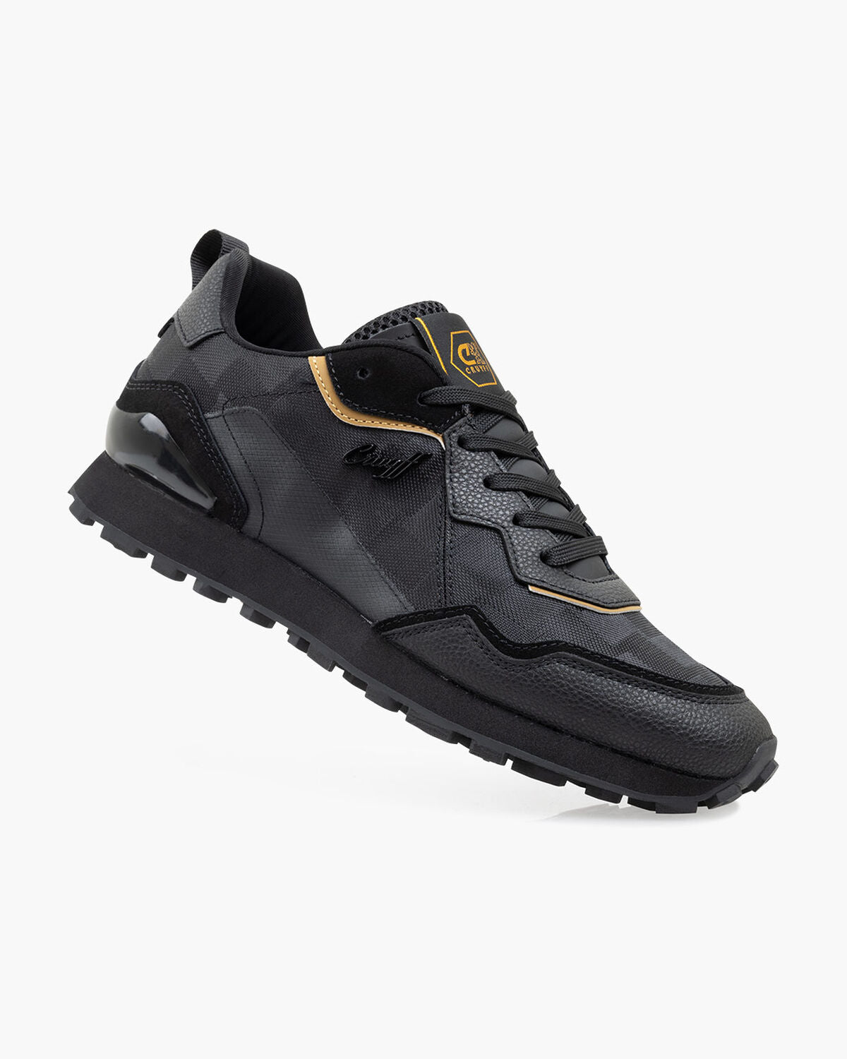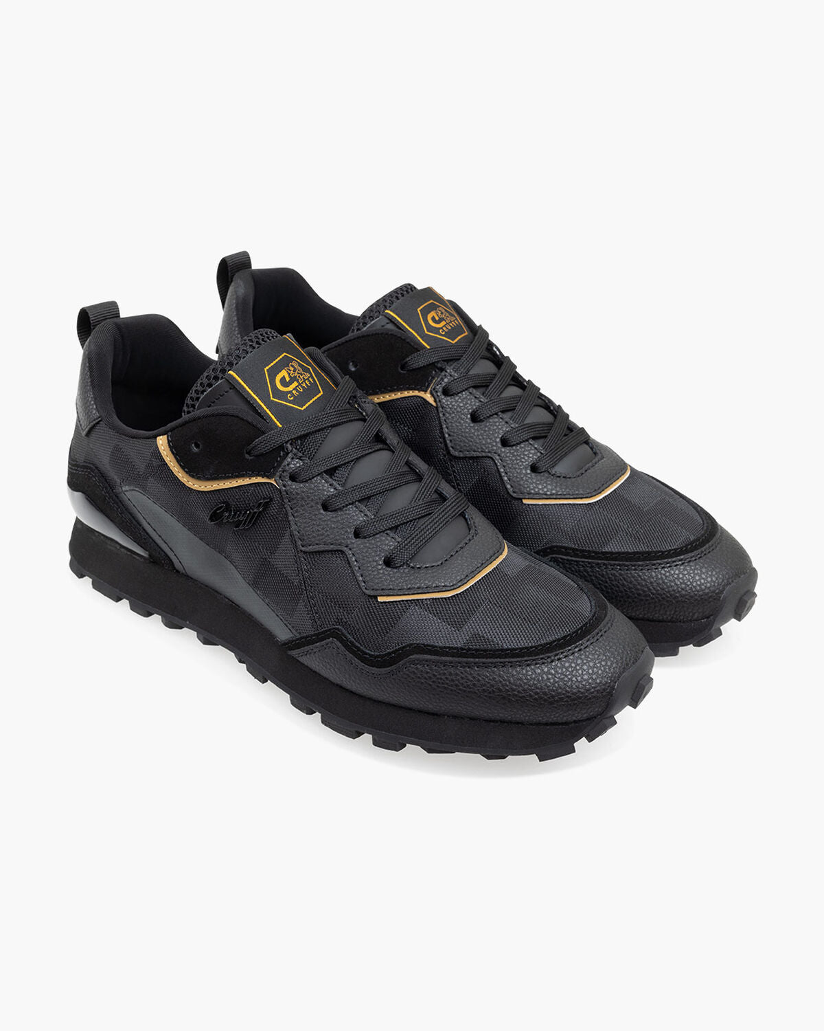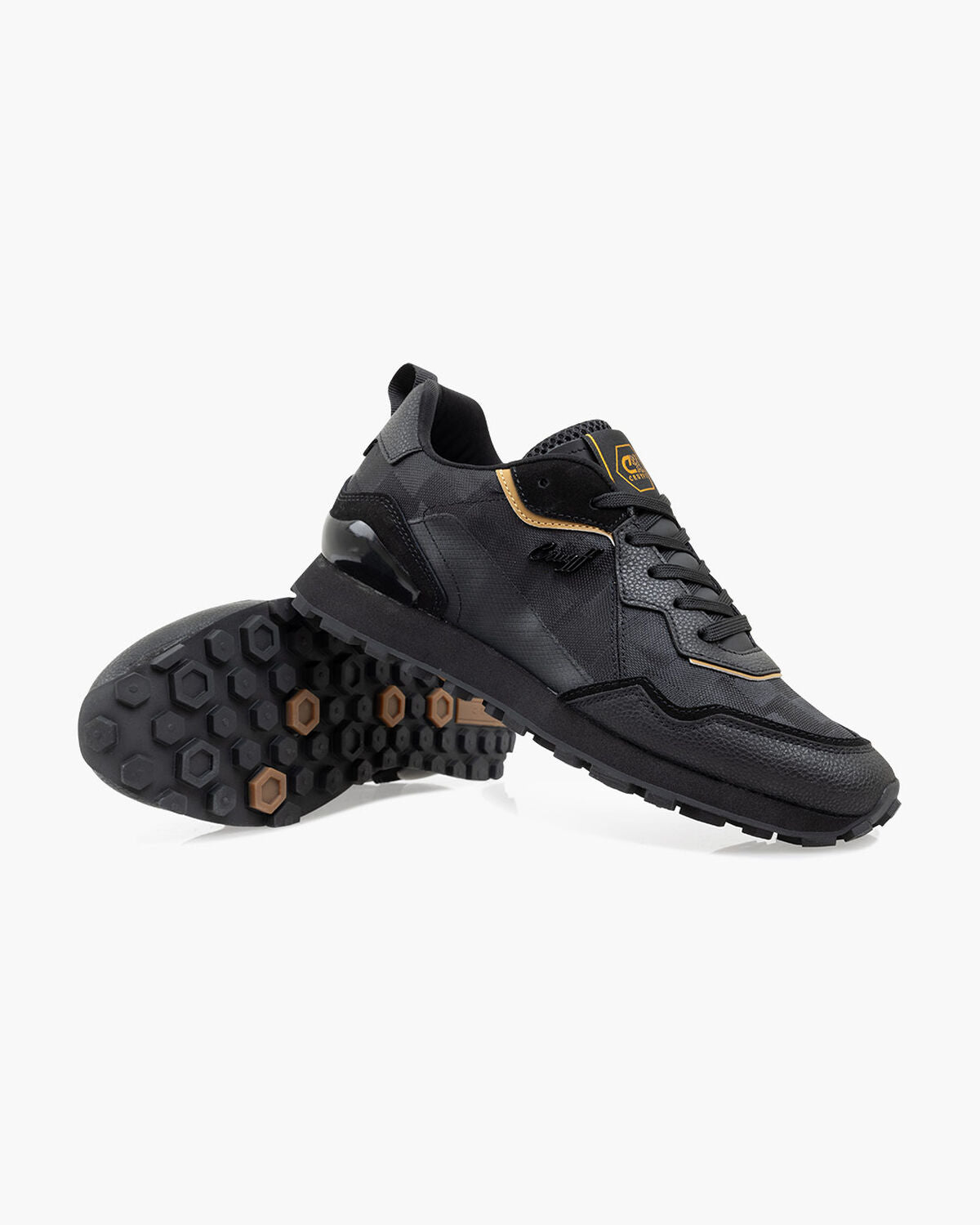 Elevate your style game with the Cruyff Superbia Minimalist Sneaker. This sleek sneaker in black and gold features a lace-up design with a glamorous gold detail on the tongue. Its unique checkered pattern adds a touch of sophistication, while the branded pull tab adds the perfect finishing touch. Experience the perfect blend of fashion and functionality with these must-have sneakers.